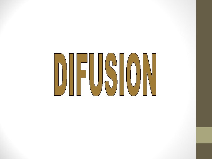 DIFUSION Es el movimiento de moléculas de una región de alta concentración a otra de menor concentración, producido por la energía cinética de las moléculas. La VELOCIDAD de difusión es una FUNCION del TAMAÑO de la molécula y la TEMPERATURA. Son dos casos particulares de difusión: