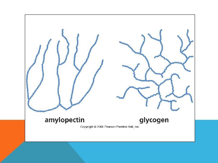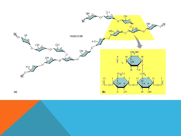 ALMIDON AMILOPECTINA: polímero de cadena ramificada formado aprox. 10000 unidades de glucosa, unidas por enlace α 1 -4 y cada 25 unidades de glucosa aproximadamente aparece una ramificación con enlace α 1 -6. Produce un color rojo – café al reaccionar con yodo