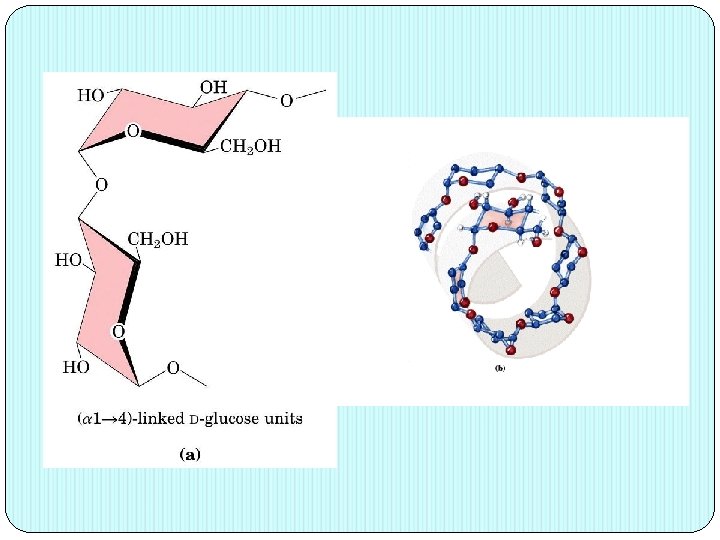 ALMIDÓN AMILOSA: polímero lineal formado por 250 -300 unidades de α-D-glucopiranosa, exclusivamente por enlaces (α 1 -4). unidas La amilosa se disuelve fácilmente en agua, adquiriendo una estructura secundaria característica, de forma helicoidal. Produce un azul intenso cuando reacciona con yodo.