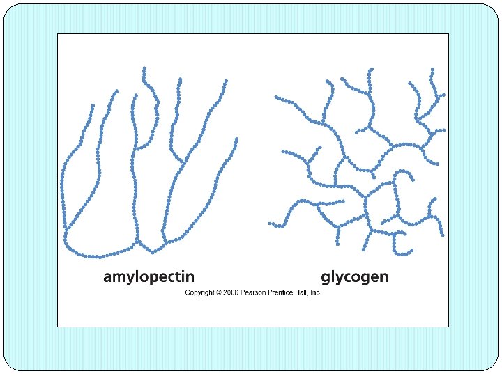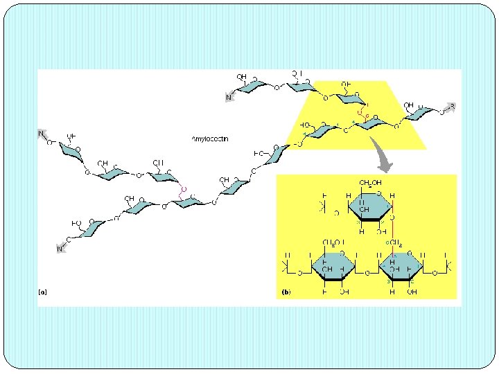 ALMIDON AMILOPECTINA: polímero de cadena ramificada formado aprox. 10000 unidades de glucosa, unidas por enlace α(1 -4) y en las ramificaciones, enlace α(1 -6). Produce un color rojo – café al reaccionar con yodo