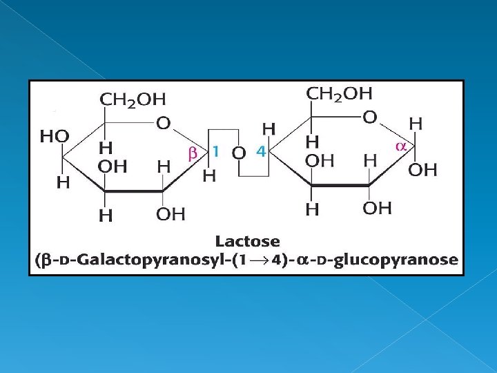Los disacáridos de importancia biológica son: Lactosa = galactosa + glucosa ( β 1 4) Maltosa = glucosa + glucosa (alfa-1, 4) Sacarosa o Sucrosa = glucosa + fructosa (α 1 2)