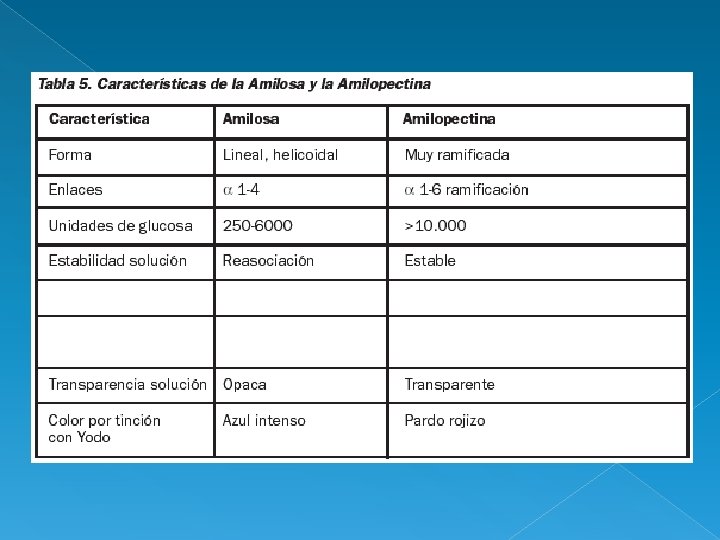 El almidón natural se compone aproximadamente de 10 -20% de amilosa y de 80 -90% de amilopectina. Amilosa: tiene una cadena continua formada por unidades de D-glucosa unidas mediante enlace glicosídico alfa-1, 4 como en la maltosa. Adquiere estructura en espiral, por lo que produce un color azúl intenso cuando se trata con yodo.