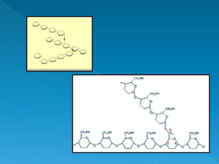 Amilopectina: es una cadena ramificada compuesta por unidades de glucosa, unidas por enlace glicosídico alfa-1, 4 pero ocasionalmente tiene enlaces glicosídicos alfa-1, 6 a los cuales se deben las ramificaciones. Ramificación cada 20 ó 30 unidades. No forma estructura en espiral debido a las ramificaciones de su cadena, por lo que produce un color rojo-café cuando se trata con yodo. Amilopectina 80 % Almidón H 2 O Δ Amilosa 20 %