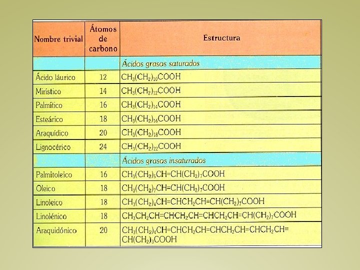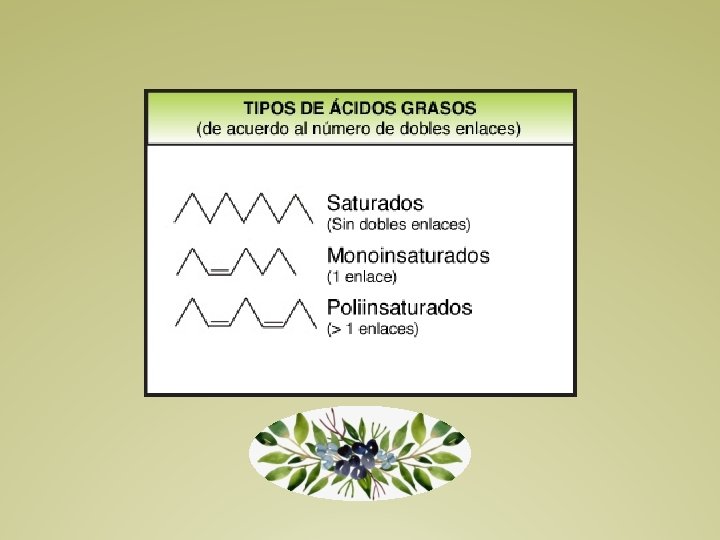 Fórmula general saturados: Cn. H 2 n+1 COOH Fórmula general de insaturados: Cn. H 2 n-1 COOH (1 doble enlace) Cn. H 2 n-3 COOH (2 dobles enlaces) Cn. H 2 n-5 COOH (3 dobles enlaces)