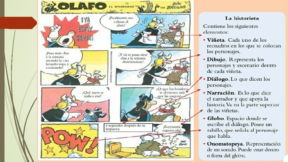 La historieta Es una forma de narrar historias a través de imágenes secuenciales que pueden tener dibujos y palabras combinadas o simplemente dibujos. Para analizar una historieta se debe tener presente algunos aspectos fundamentales, tales como: Tiene unos elementos propios. Es diseñada con un propósito Se debe comprender la historieta como un relato que va más allá de la forma. Relación dibujos – palabras. Tener claro que cada viñeta responde a un momento del relato.