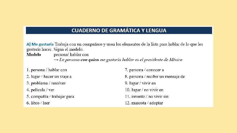 Ponlo a prueba A) Sobre la educación Lee las siguientes oraciones y complétalas con el pronombre relativo que, quien o quienes, según sea necesario. 1. El libro _____ estoy leyendo es sobre la educación en Estados Unidos. 2. El autor del ensayo, _____ enseña en la universidad, es un periodista muy conocido. 3. Los estudiantes _____ aprueben el curso podrían solicitar una beca _______ está disponible para alumnos ____ tengan un promedio de más de 8, 5. 4. El profesor a ____ le pedí una carta de referencia no me ha respondido. 5. En la película Stand Deliver los alumnos, a ____ se discrimina, son acusados de hacer trampa toman el examen una segunda vez.