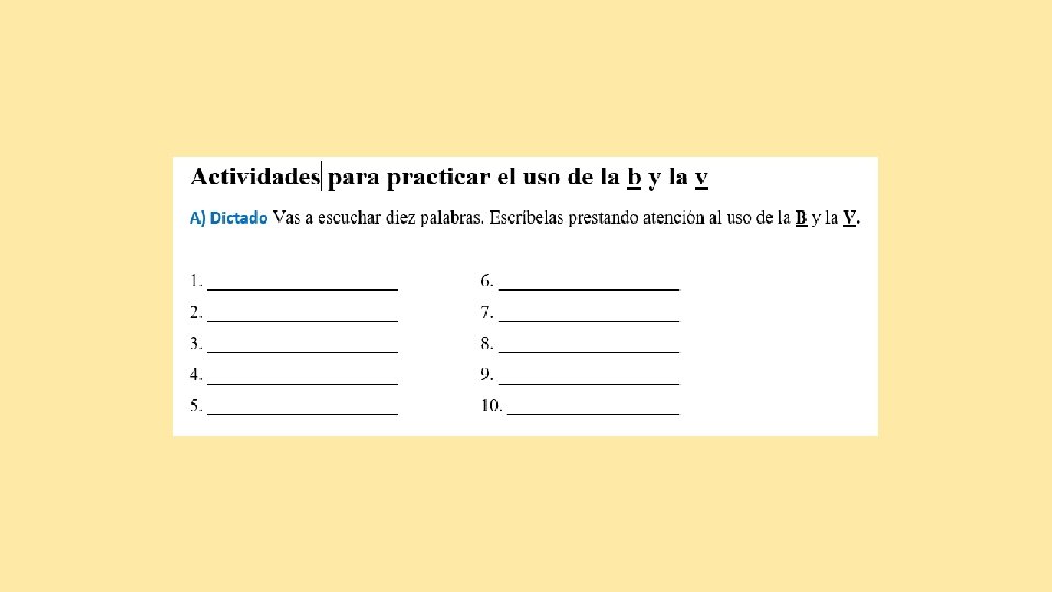 La B y la V Reglas básicas para las palabras que se escriben con B 1) Antes de cualquier consonante se necesita la b. Ejemplos: cambio, cable, mueble, brisa, brillo, obvio 2) Las terminaciones del imperfecto de los verbos acabados en -ar y del verbo ir necesitan la b. Ejemplos: iba, jugábamos, hablaban 3) Los verbos que terminan en -bir, -buir, así como todas sus formas conjugadas requieren la b. Ejemplos: prohibir, recibir, caber, saber. Excepciones: Hervir, servir, vivir y sus compuestos. 4) Los infinitivos y las formas conjugadas de los verbos beber, caber, deber, haber y saber. Ejemplos: beberá, cabían, había, sabíamos.