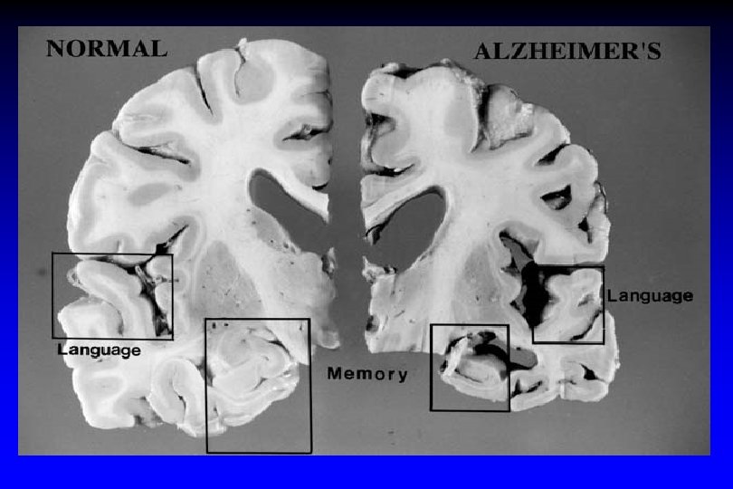 Alzheimer’s disease • Alzheimer’s disease – three types of memory problems äepisodic memory impaired (e. g. , free recall) äexecutive function (WM of Baddeley appears to be affected) äsemantic memory is also impaired – note: pure amnesics do not have the latter two impairments
