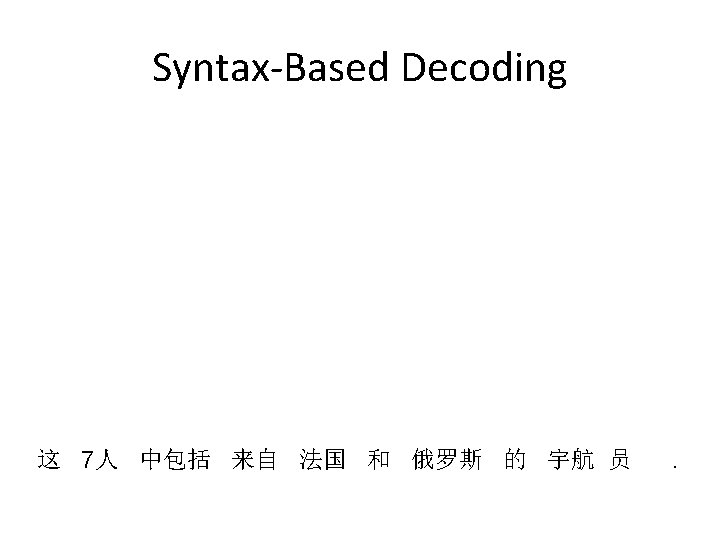 Syntax-Based Decoding “these” RULE 1: DT(these) 这 “include” RULE 2: VBP(include) 中包括 “France” RULE 4: NNP(France) 法国 “and” RULE 5: CC(and) 和 “Russia” RULE 6: NNP(Russia) 俄罗斯 “astronauts” RULE 8: NP(NNS(astronauts)) 宇航 , 员 这 7人 中包括 来自 法国 和 俄罗斯 的 宇航 员 “. ” RULE 9: PUNC(. ) . .
