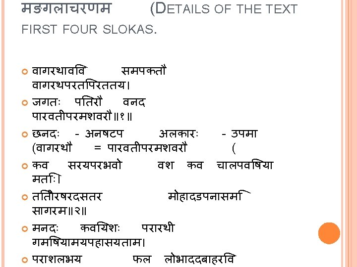 CONT. Nītiśatakam- Introduction(Author & Text) Appropriateness of Title, 1 st sloka with translation and various analyses (grammar, background, explanation, metre etc. ) द कक ल दयवचछ नन ननतच नम त रमरतय। सव नभतयकम न य नम श नत य तजस॥१॥ (मरखपदधत (