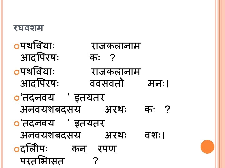 HANDOUT 3 SANSKRIT (H) SEM-1, 2019 Raghuvamśam unit I canto I-verse 1 -10 Marks-10 Introduction (author and text) grammatical analysis explanation translation meaning content analysis Appropriateness of title Characteristic of raghu clan Unit II canto I - Verse 11 -25 Marks-10 Role of Dilip in the welfare of subject v v v v