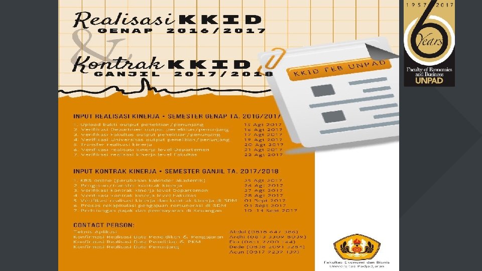 Time Line KKID Realisasi Kinerja No 1 Kegiatan Upload Bukti output penelitian/penunjang (staff Portal) Aktor Dosen Tgl. Mulai Tgl. Akhir 15/08/2017 2 Verifikasi Departemen output penelitian/penunjang Kadep 16/08/2017 3 4 5 Verifikasi Fakultas output penelitian/penunjang Verifikasi Universitas output penelitian/penunjang Pengisian/transfer realisasi kinerja (staff Portal) Dekan Direktorat Dosen 17/08/2017 19/08/2017 20/08/2017 6 Verifikasi realisasi kinerja level Departemen Kadep 21/08/2017 7 Verifikasi realisasi kinerja level Fakultas Dekan 22/08/2017 Kontrak Kinerja 1 KRS online (perubahan kalender akademik) 25/08/2017 2 Pengisian/transfer Kontrak kinerja (staff Portal) 26/08/2017 3 Verifikasi kontrak kinerja level Departemen 27/08/2017 4 Verifikasi kontrak kinerja level Fakultas 28/08/2017 5 Verifikasi realisasi kinerja dan kontrak kinerja di SDM 01/09/2017 6 Proses rekapitulasi pengajuan remun di SDM 03/09/2017 7 Perhitungan pajak dan Pembayaran di Keuangan 10/09/2017 14/09/2017