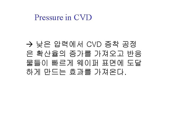 CVD Gas Flow Dynamics 기체 흐름 역학은 균일한 막 증 착을 위해 매우 중요하다. 기체 상태에서 웨이퍼 표면까지 의 기체 운반은Gas확산(Diffusion)의 flow 메커니즘이다. Diffusion of reactants Reaction product Deposited film Silicon substrate