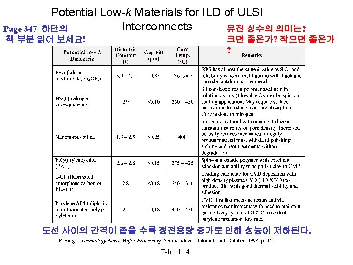 Low-k Dielectric Film Requirements 중요함 Page 350 상단의 표 11 -5 읽어 보세요! Table 11. 5