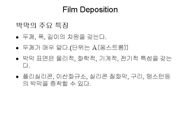 Film Deposition Thin Film Characteristics (매우 중요) · Good step coverage · Ability to fill high aspect ratio gaps (conformality) · Good thickness uniformity · High purity and density · Controlled stoichiometries · High degree of structural perfection with low film stress · Good electrical properties · Excellent adhesion to the substrate material and subsequent films