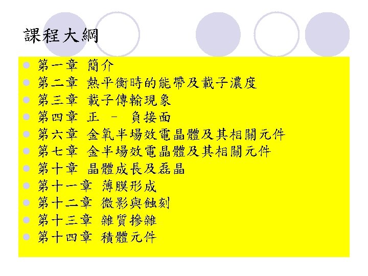 參考書籍: S. M. Sze (施敏) ………………教科書 SEMICONDUCTOR DEVICES Physics and Technology 2 nd Edition l Donald A. Neamen SEMICONDUCTOR PHYSICS & DEVICES BASIC PRINCIPLES 2 nd Edition l Hong Xiao Introduction to Semiconductor Manufacturing Technology l 莊達人編著 VLSI製造技術 (五版修訂) l