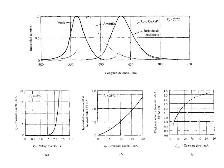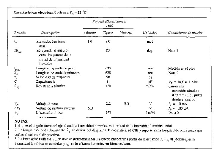 LED Cerca de la unión p-n existe un proceso de recombinación de huecos y electrones. En este proceso se genera energía térmica o luminosa. En diodos de Si o Ge la mayor parte es energía térmica, pero en diodos de fosfuro arseniuro de galio Ga. Ar. P y fosfuro de galio Ga. P, se genera suficiente luz visible. ID + VD -