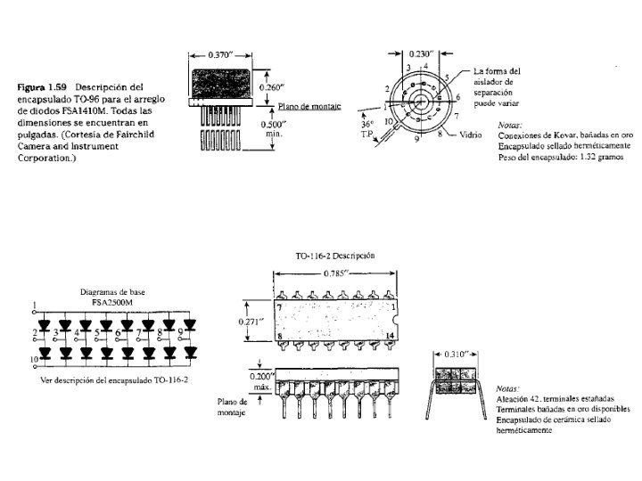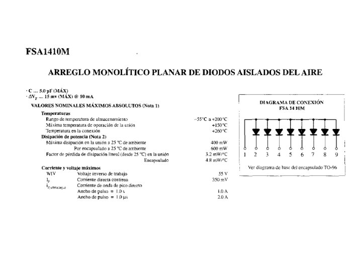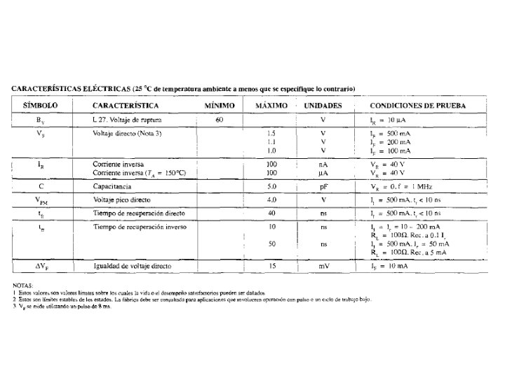 Hojas de datos Las hojas de datos deberán especificar: Voltaje directo VF (a una corriente y temperatura especificadas) Corriente directa máxima IF (a una corriente y temperatura especificadas) La corriente inversa de saturación I 0, Is o IR (a una corriente y temperatura especificadas) El valor del voltaje inverso PIV, PRV o. VBR. El nivel máximo de disipación de potencia a una temperatura en particular Los niveles de capacitancia El tiempo inverso de recuperación El rango de temperatura de operación ver p. 55 Boylestad