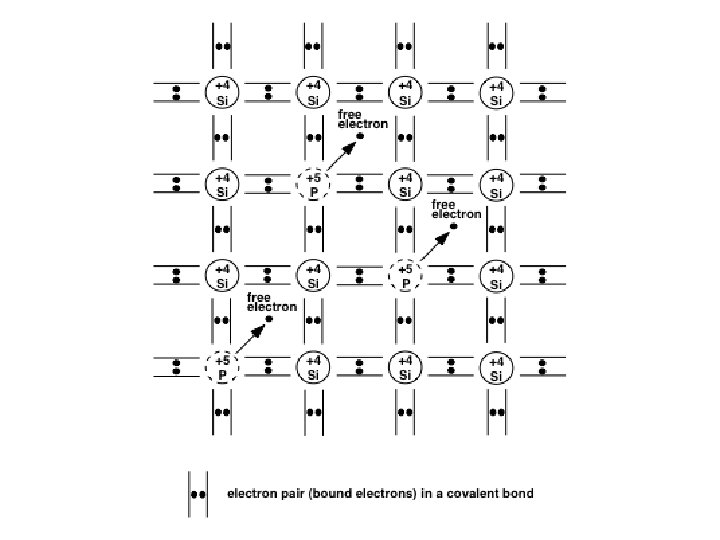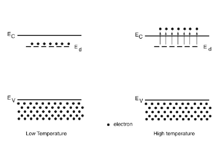 N-Type Semiconductor - Elemental semiconductor, e. g. Si, doped with Group V impurity such as P to a level of Nd per unit volume. - Group V atom is a "donor" and its level in the energy gap, Ed , is called donor level or state. - In n-type no >> po, and if all donors donate electrons then no ~ Nd.