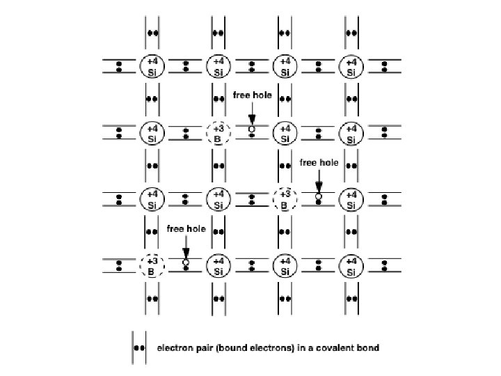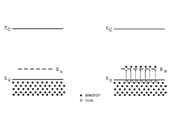 P-Type Semiconductor - Elemental semiconductor, e. g. Si, doped with Group III impurity such as B to a level of Na per unit volume. - Group III atom is ”acceptor" and its level in the energy gap, Ea , is called acceptor level or state. - In p-type po>>no, and if all acceptors accept electrons then po ~ Na.