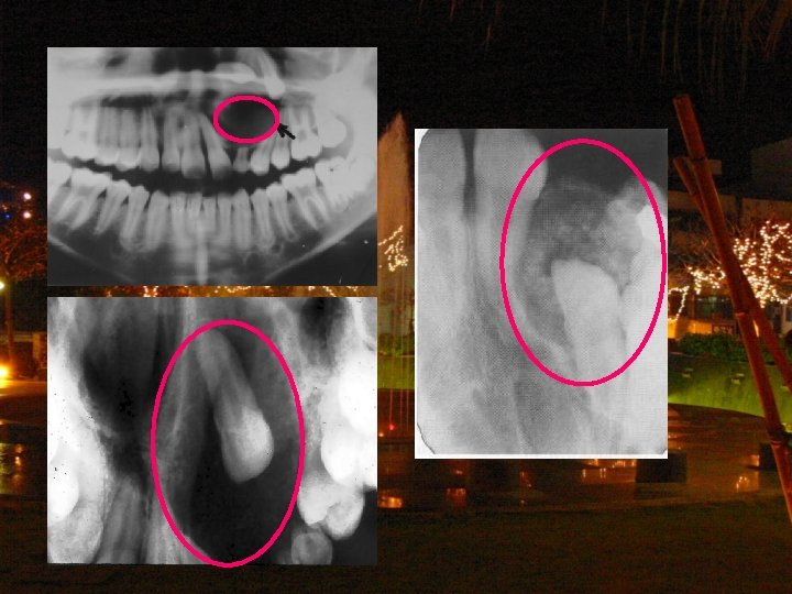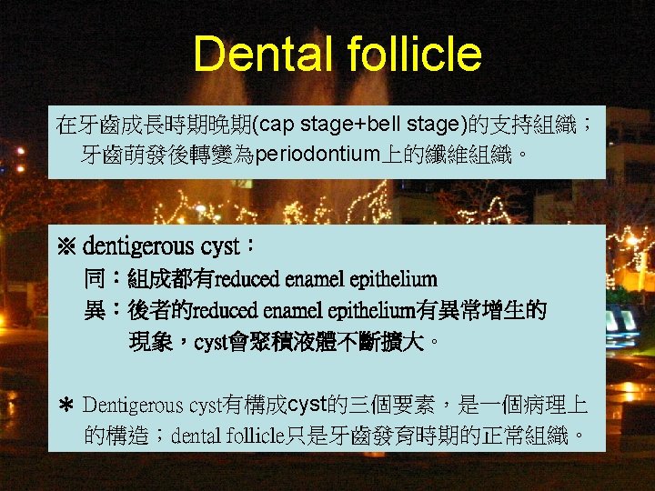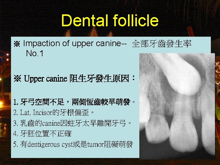 Paradentalcyst 病理特徵 好發位置:mandibular third molar的lateral root surface、靠近cervical margin 致病原因:uncertain. involved by pericoronitis (usually lower 3 rd molar).