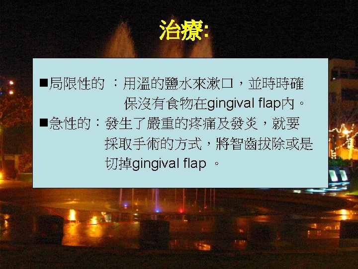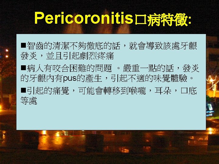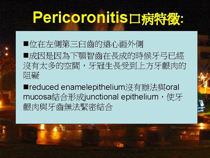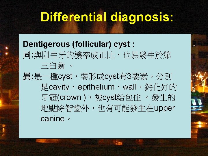 Differential diagnosis: Paradental cyst: 同: 同樣是發生在第三下顎臼齒的遠心面外 側或facial aspect,與部份阻生的牙齒有 關 。 異: 它所形成的是cyst,要形成cyst有3要 素,分別是cavity,epithelium,wall。 而pericoronitis並非cyst。
