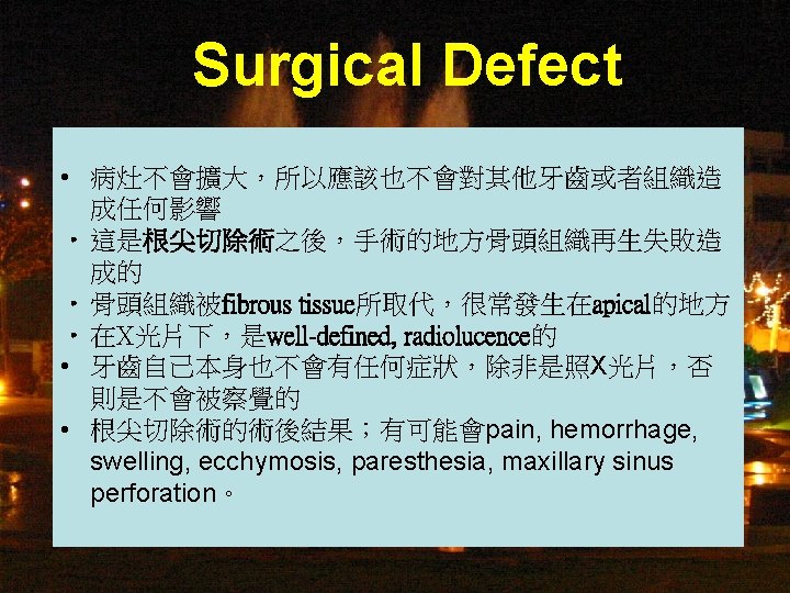 Differential diagnosis • Periapical granuloma: 根尖處牙周膜肥厚(raiolucency) Well-defined with a corticated radiopaque line or zone of sclerotic bone. • Radicular cyst: 與periapical granuloma類似,無法以radiolucency區別。 • Osteomyelitis: poor-defined “moth-eaten” radiolucency
