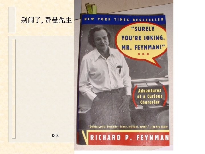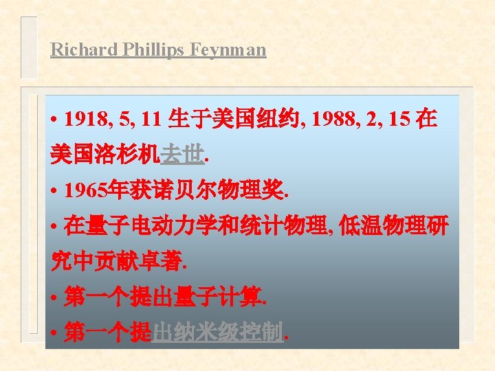 Seminar at Caltech Richard Feynman lecturing at Caltech Slides: 47 Download presentation Seminar at Caltech Richard Feynman lecturing at Caltech Seminar Day 1978 Physics. 返回 Richard Phillips Feynman Richard Feynman's blackboard at time of his death 返回 Richard Feynman playing the bongo drums 返回 Richard Feynman lecturing on quantum mechanics 返回 Richard Feynman at Caltech press conference following space shuttle investigation. 返回 Richard Feynman dancing with Trudy Eyges at Cornell 1948 返回 Richard Feynman at Caltech's Spring Talent Show. 1966 返回 Richard Feynman teaching Physics X . 返回 WE LOVE YOU DICK • Banner was placed on Millikan Library following the announcement of his death 返回