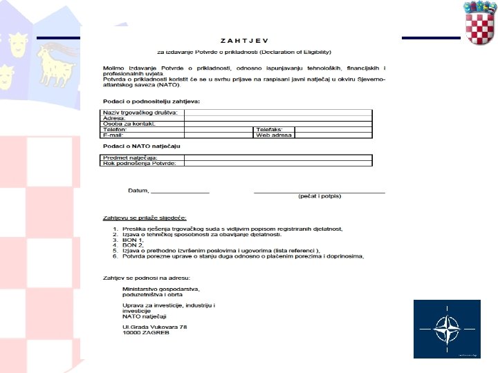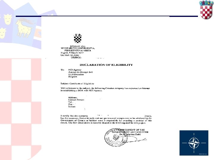 Potvrda o prikladnosti — izdaje MGPO na zahtjev tvrtke sukladno uvjetima natječaja ili na zahtjev NATO institucija — Sadrži: Ø naziv tvrtke Ø adresu i e-mail Ø djelatnost Ø kontakt osobu (brojeve telefona i faxa) Ø Internet stranicu — Potvrda se izdaje na engleskom jeziku — Potpisuje ministrica gospodarstva