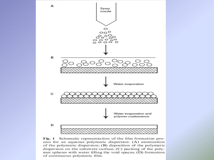 Formation of films from aqueous polymeric dispersions This requires the coalescence of polymer particles into a continuous film. This process involves: • Rapid evaporation of water, causing the particles of dispersed polymer to be brought into close contact with one polymer. • Development of pressures (associated with capillary forces within the structure) that overcome repulsive forces between particles and cause deformation of the polymer particles. • Gradual coalescence of the polymer particles as a result of viscous flow and movement of polymer molecules across the interfaces between particles. Aqueous polymeric dispersions must be processed at temperatures in excess of the glass-transition temperature of the polymer.