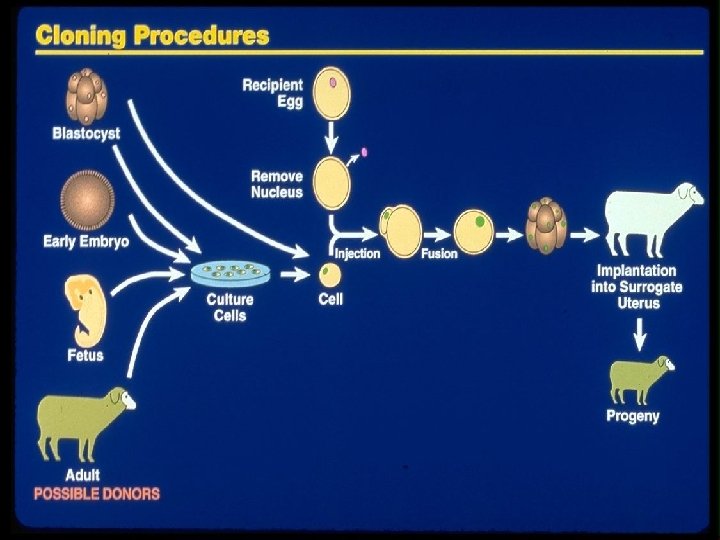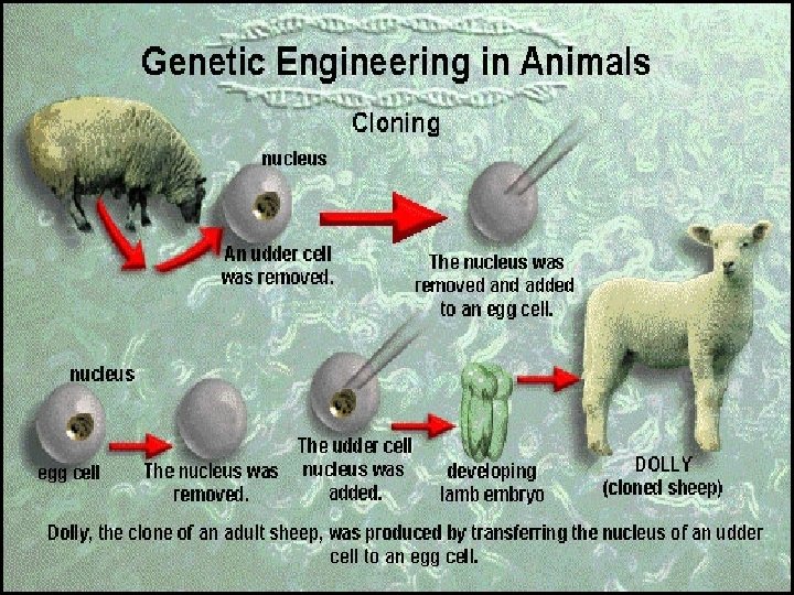 Nuclear Transfer n Removing the nucleus of an unfertilized egg and replacing it with the nucleus of a donar cell (hence containing the complete genome) n An electric current is used to fuse the nucleus in the cell and trigger the egg to begin developing n The reconstructed eggs are then implanted into a surrogate mother. n Somatic cells can be cultured, subjected to genetic manipulation in vitro and then produce viable animals by means of nuclear transfer.