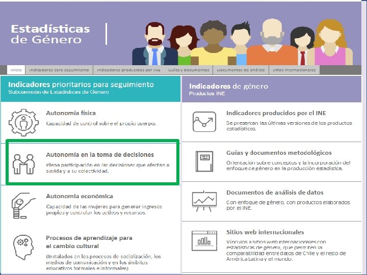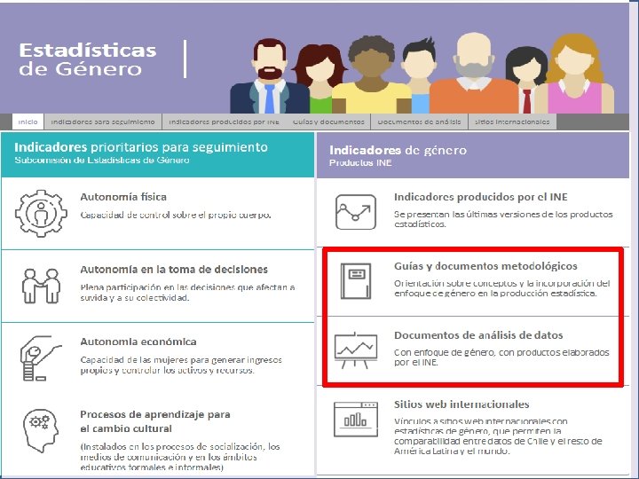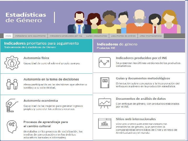 Se crea el Micrositio de Estadísticas de Género: Iniciativa de la Subcomisión de Estadísticas de Género Comisión Nacional de Estadísticas (Reactivada en 2014) Subcomisión de Estadísticas de Género (Creada hacia fines de 2014) Instituto Nacional de Estadísticas Rol técnico: verificación de la calidad de los indicadores Ministerio de la Mujer y la Equidad de Género Rol político: priorización de áreas e indicadores Coordinación y gestión Sectores que participan de forma permanente Sectores que participan de forma no permanente Rol: proporcionan información