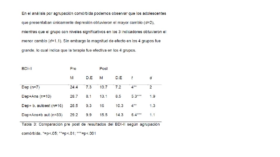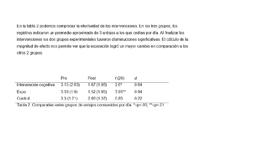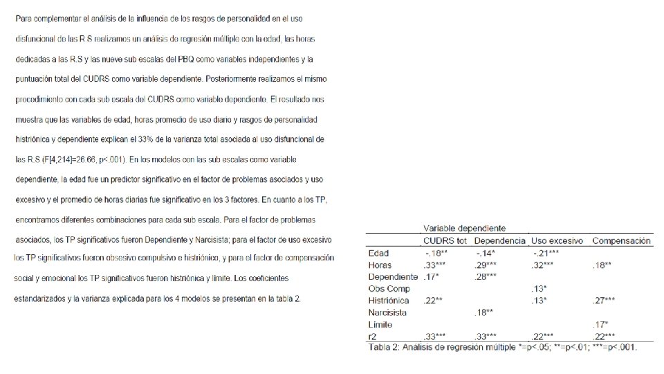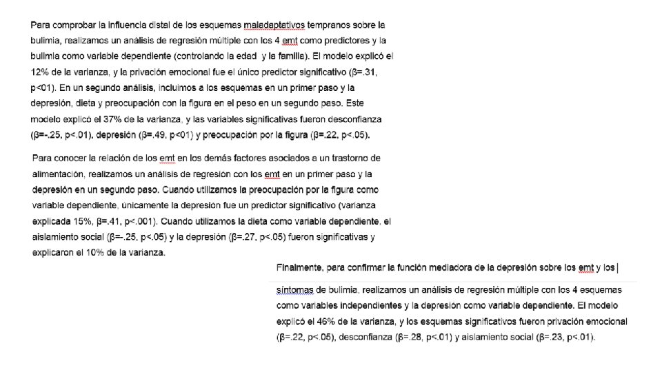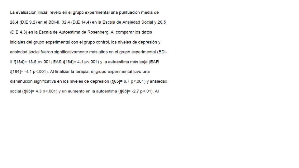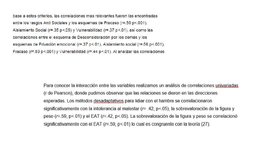 Resultados cuantitativos (redactados) • Los valores estadísticos se mencionan una sola vez (ya sea en la redacción o en una tabla) • Si es en la redacción, estos se incluyen entre paréntesis • Correlación y Regresión Múltiple • (valor estadístico [r o B] y nivel de significancia [p> o < a. 05]) • En regresión múltiple incluimos la varianza explicada (en porcentaje) • Prueba t • Las 2 medias con desviación estándar, estadístico t, grados de libertad y nivel de significancia • *Los grados de libertad para la prueba t para grupos independientes es el tamaño de la muestra -2 (si el tamaño de la muestra es 120, los grados de libertad son 118) • *Los grados de libertad para grupos emparejados es el tamaño de la muestra -1.