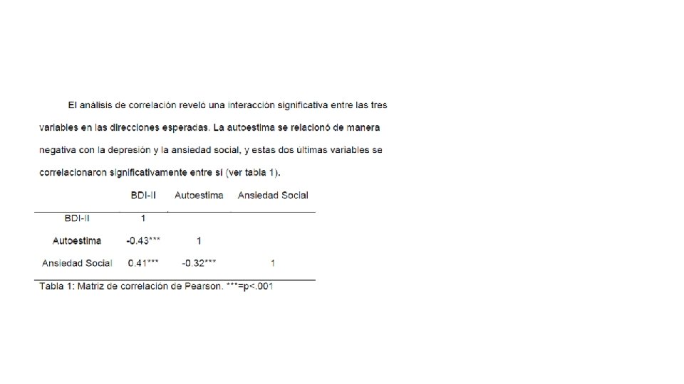 Introducción al análisis • Razonamiento de usar este análisis • ¿Con qué objetivo se conecta? • Para conocer la magnitud y dirección de la relación entre (mencionar variables) realizamos un análisis de correlación de Pearson. Los resultados indican que… • Para conocer si existe una diferencia entre (mencionar grupos) en (mencionar variable), realizamos una prueba t para grupos independientes, y encontramos que. . . • Con el objetivo de confirmar la contribución específica de (variable) sobre (variable dependiente), realizamos un análisis de regresión múltiple jerárquico. En el primer paso usamos (mencionar variables), en el segundo (mencionar variables) y por último (mencionar variable)