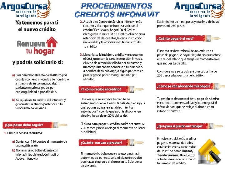 REQUISITOS PARA OBTENER CREDITOS INFONAVIT 1. Ser Asegurado IMSS o Derechohabiente INFONAVIT con relación laboral vigente 2. Reunir 116 puntos de acuerdo a los criterios del INFONAVIT 3. Tomar el curso “Saber para decidir” (en línea o presencial)