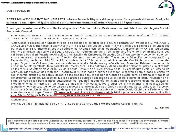 APLICACIÓN IMSS ART 32 -D CFF Surge una nueva Constancia de la opinión de cumplimiento de obligaciones fiscales en materia de seguridad social, de acuerdo Acuerdos de consejo Técnicos publicados en la página de Cofemer donde se pueden ver todas las características y elementos que llevara esa constancia, lo sobre saliente es que esa constancia será OBLIGATORIA PARA: 1. Empresas particulares que quiera participar en LICITACIONES, de ADQUISICION DE BIENES, ARRENDAMIENTOS, PRESTACION DE SERVICIOS (sin importar valores) Y/O CONSTRUCCION DE OBRA PUBLICA, cuyo valor sea mayor de $300, 000. 00 Pesos 2. Empresas que requieran OBTENER ESTIMULOS O SUBSIDIOS de la Administración Federal y el monto máximo de $30, 000. 00 Pesos 3. Esta opinión será NEGATIVA(Con créditos Fiscales firmes) o POSITIVA sin adeudos • Dicha CONSTANCIA, se obtenida SOLO POR EL ESCRITORIO VIRTUAL DEL IMSS. En 2015, habrá una modificación al Reglamento de la Industria de la construcción para hacer "obligatoria" esta Constancia