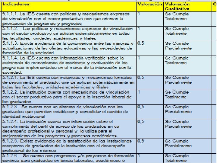 VALORACIÓN DE CRITERIOS § Realizada la valoración de los indicadores se sumarán los resultados y se promediarán, obteniendo de esta manera un valor numérico para cada criterio. El grado de cumplimiento del criterio se podrá obtener sobre la base de la escala establecida para el efecto, tal como puede verse en la tabla siguiente: VALORACIÓN CUALITATIVA VALORACIÓN Totalmente 0, 91 – 1, 00 Satisfactorio 0, 80 – 0, 90 Suficiente 0, 70 – 0, 79 Escaso 0, 60 – 0, 69 No cumple 0, 00 - 0, 59