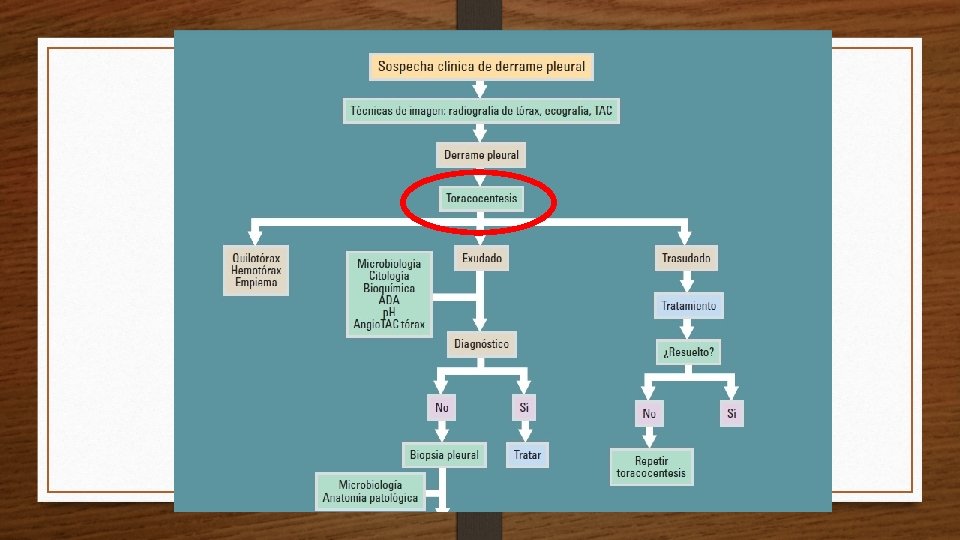 Toracocentesis diagnóstica 1. Diferenciar entre Trasudado y Exudado. 2. Características del Liquido Pleural (LP) CRITERIOS DE LIGHT q Cociente Proteínas en LP/proteínas es suero > 0. 5 q Cociente LDH en LP/LDH en suero > 0. 6 q LDH en LP superior a 2/3 de su valor normal en suero Presencia de uno de estos criterios identifica exudados. S=95 -100% E=7090%