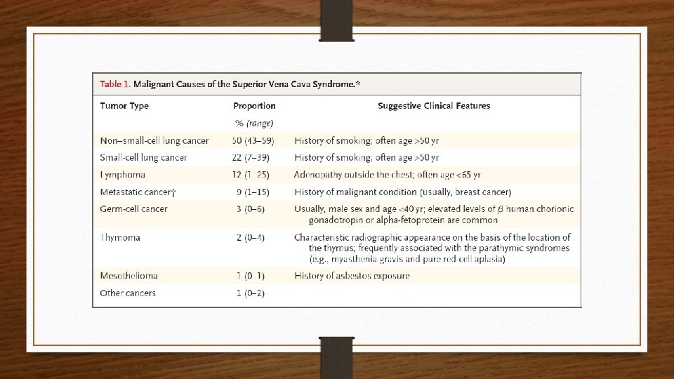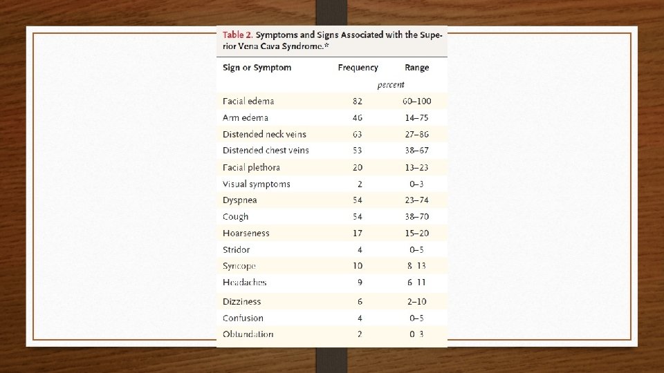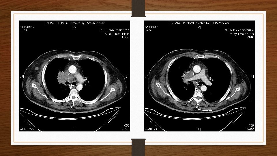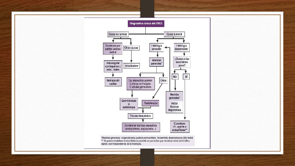 RESUMEN • Paciente varón de 60 años fumador • Dolor torácico derecho + disnea + hemoptisis + edema facial/cervical + cambio en el tono de voz • Exploración: edema facial/cervical, hipoventilación CSD + IY • Rx: Masa en LSD (Signo de Golden) • TC Tórax: masa pulmonar LSD que se extiende a mediastino con una cava superior filiforme.