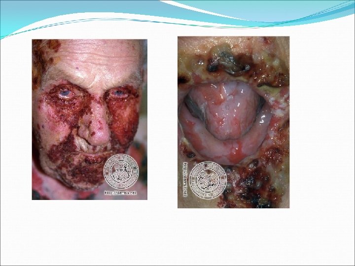 Rumień wielopostaciowy wysiękowy Choroba autoimmunologiczna – wirusy, mykoplazmy, leki Postacie: RWW, zespół Stevens-Johnsona (dołączają się wysoka gorączka i bóle stawowe), zespół Lyele (toksyczna epidermoliza naskórka) Bardzo ważna identyfikacja czynnika etiologicznego Zmiany zróżnicowane. Charakterystyczny wygląd warg (strupy) Zmiany na skórze (kończyny), występują symetrycznie Kilkutygodniowe epizody, nawracający charakter Leki miejscowe, antyhistaminowe, uszczelniające naczynia