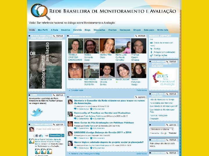 Missao e Visao • Visão “a sociedade brasileira tem avaliação e monitoramento como valor e estratégia de aprendizagem e tomada de decisão para qualificar instituições, programas e políticas, fortalecendo processos democráticos”. • missão promover diálogos entre os diversos atores do campo do monitoramento e avaliação, estimulando teorias e práticas cada vez mais relevantes para a sociedade brasileira