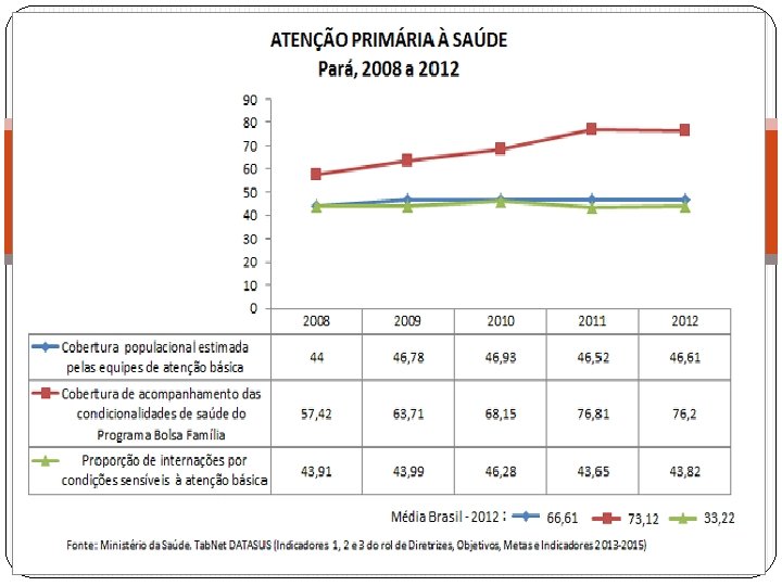 Ranking por componente do financiamento no PARÁ 2011 2012 2013 2014 Média Despesa per capita em saúde total 25º 25º 27º 25º Despesas per capita em saúde (recursos próprios) 23º 22º 25º 27º 25º Receita própria aplicada em saúde 16º 9º 12º 14º 11º 26º 25º 24º 24º 9º 7º 5º 4º 5º Transferências SUS Investimento em saúde