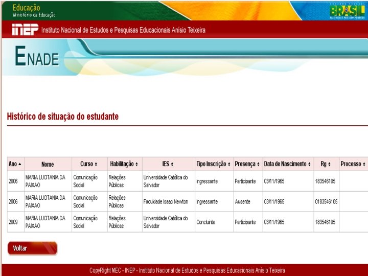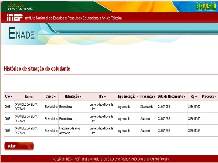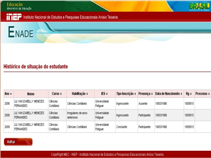 52 MEC – INEP – DAES – CGENADE – Enade 2011 – Questões Operacionais Dados recebidos da EBCT. Não podem ser alterados no Sistema Enade.