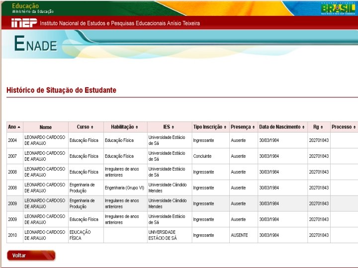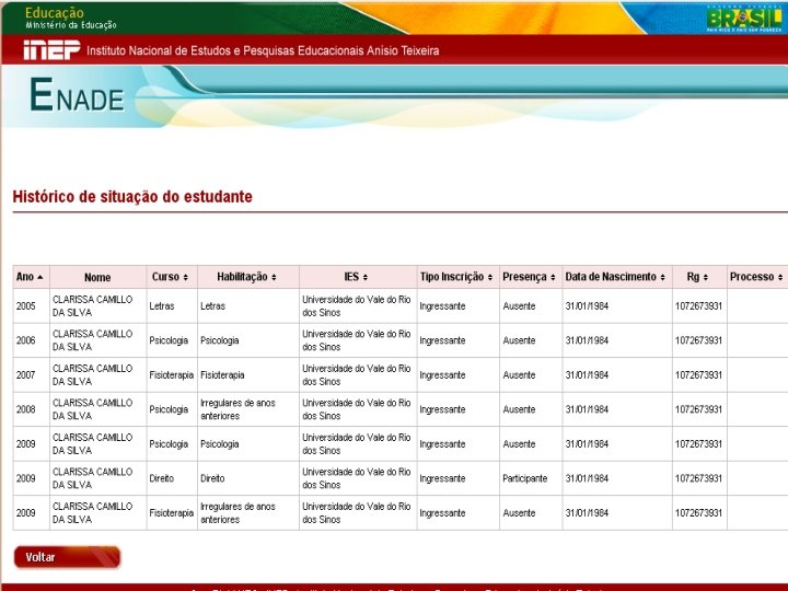 52 MEC – INEP – DAES – CGENADE – Enade 2011 – Questões Operacionais Dados recebidos da EBCT. Não podem ser alterados no Sistema Enade.