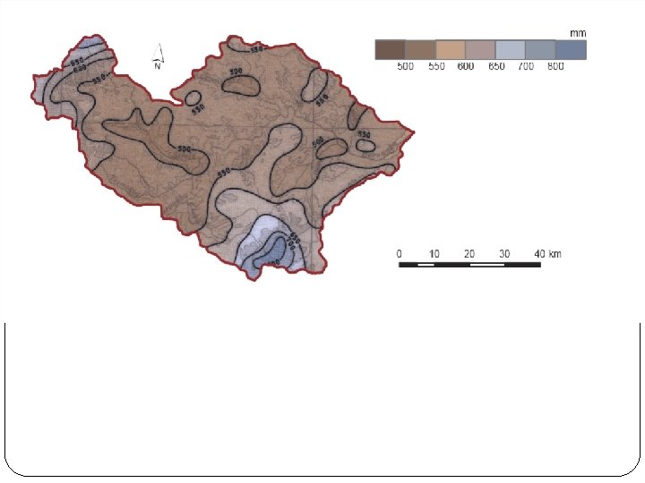 Metoda izohyet /možnost výpočtu v Arc. GISu – popsat postup do textu! - při výpočtu se vychází z mapy izohyet (mapa geografického rozložení průměrného ročního úhrnu srážek), Atlas podnebí ČSSR - změřit plochu mezi izohyetami (planimetrováním nebo čtver. metodou) - výpočet váženým průměrem (váha - plochy mezi izohyetami), 1 tabulka Tab. 5 Údaje pro výpočet průměrného ročního úhrnu srážek metodou izohyet i [mm] pi xi. pi střed intervalů izohyet plocha mezi izohyetami součin xi a pi x … průměrný roční úhrn srážek v povodí [mm] xi … střed intervalu izohyet [mm] pi … plocha mezi izohyetami [km 2]