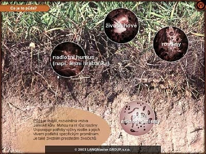 Složení a vznik půdy l l l l je nejsvrchnější vrstva zemského povrchu, která poskytuje rostlinám živiny, vodu a prostředí pro růst kořenů půda vzniká působením půdotvorných faktorů, které podmiňují půdotvorné procesy půdotvorné faktory: matečná hornina klima organizmy reliéf čas