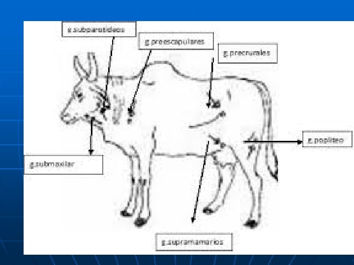 n n Ex. : Disfagia e timpanismo (compressão do nervo vago – tuberculose e actinobacilose em bovinos) Dispnéia (compressão da faringe) Tosse (compressão da traquéia e árvore brônquica) *Os linfonodos raramente são sede de uma patologia primária, já que se envolvem de maneira secundária em processos infecciosos, inflamatórios e neoplásicos.