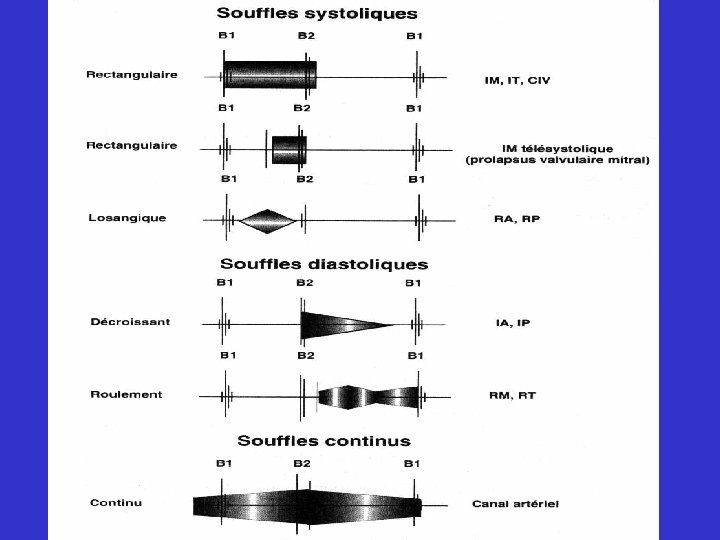 SOUFFLE CARDIAQUE • Timbre: – Doux, en jet de vapeur: IM, IT – Doux, humé, aspiratif: IAO, IP – Rude , rapeux: RAO, RP – Continue, tunnellaire: canal artériel – Roulement: timbre de basse frequence: RM, RT