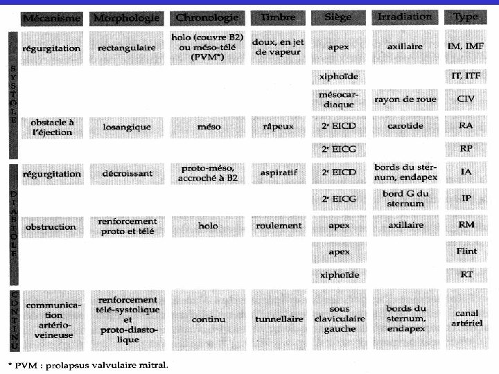 SOUFFLE CARDIAQUE • Chronologie et durée – Systolique ou diastolique – Proto: début – Méso: milieu – Télé: fin – Holo: du début à la fin – Proto-méso, méso-télé