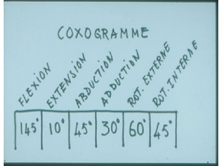 SEMIOLOGIE DE LA HANCHE 3°Signes d’examen (signes physiques): Etude des mouvements Mouvements passifs+++: le coxogramme Mouvements combinés Mouvements actifs